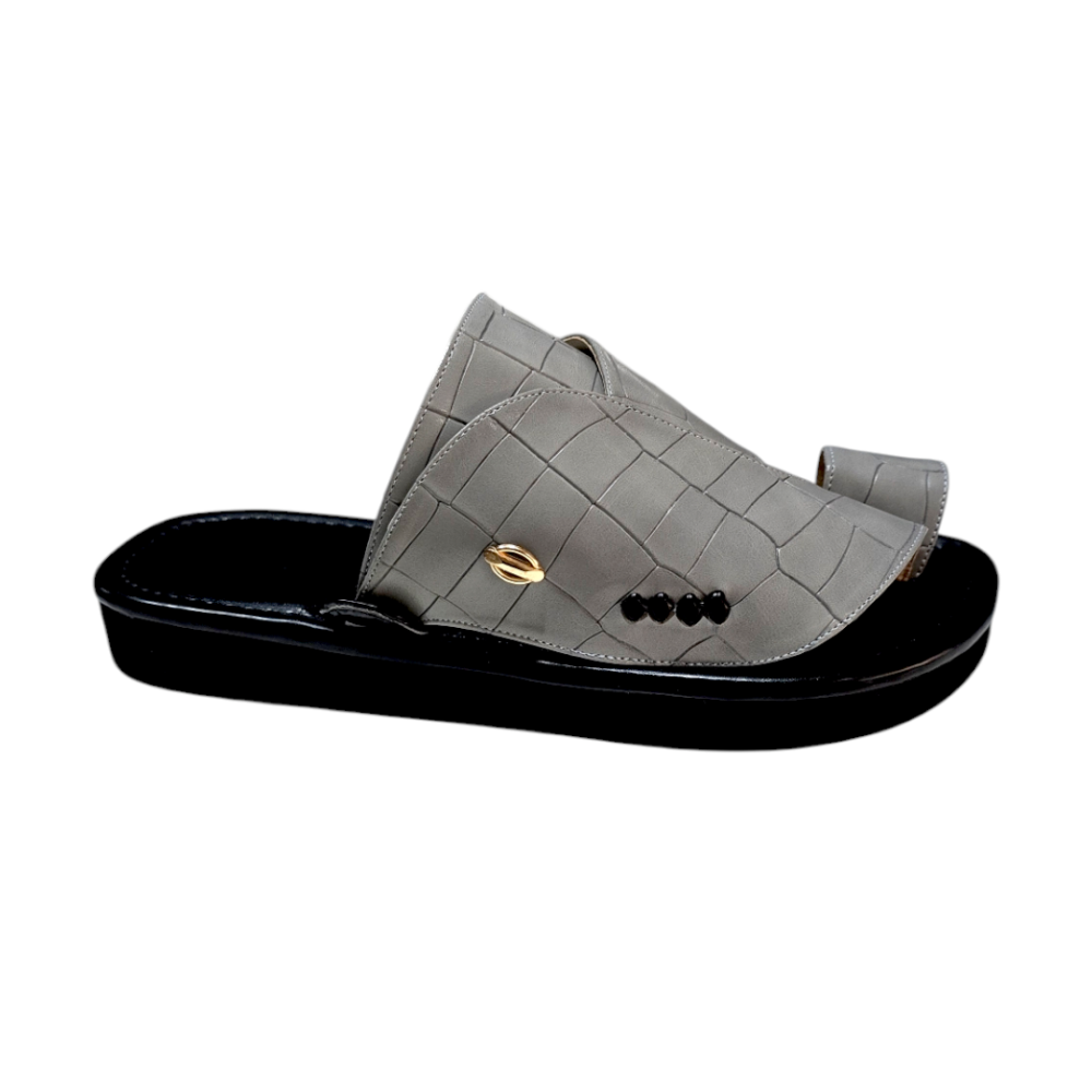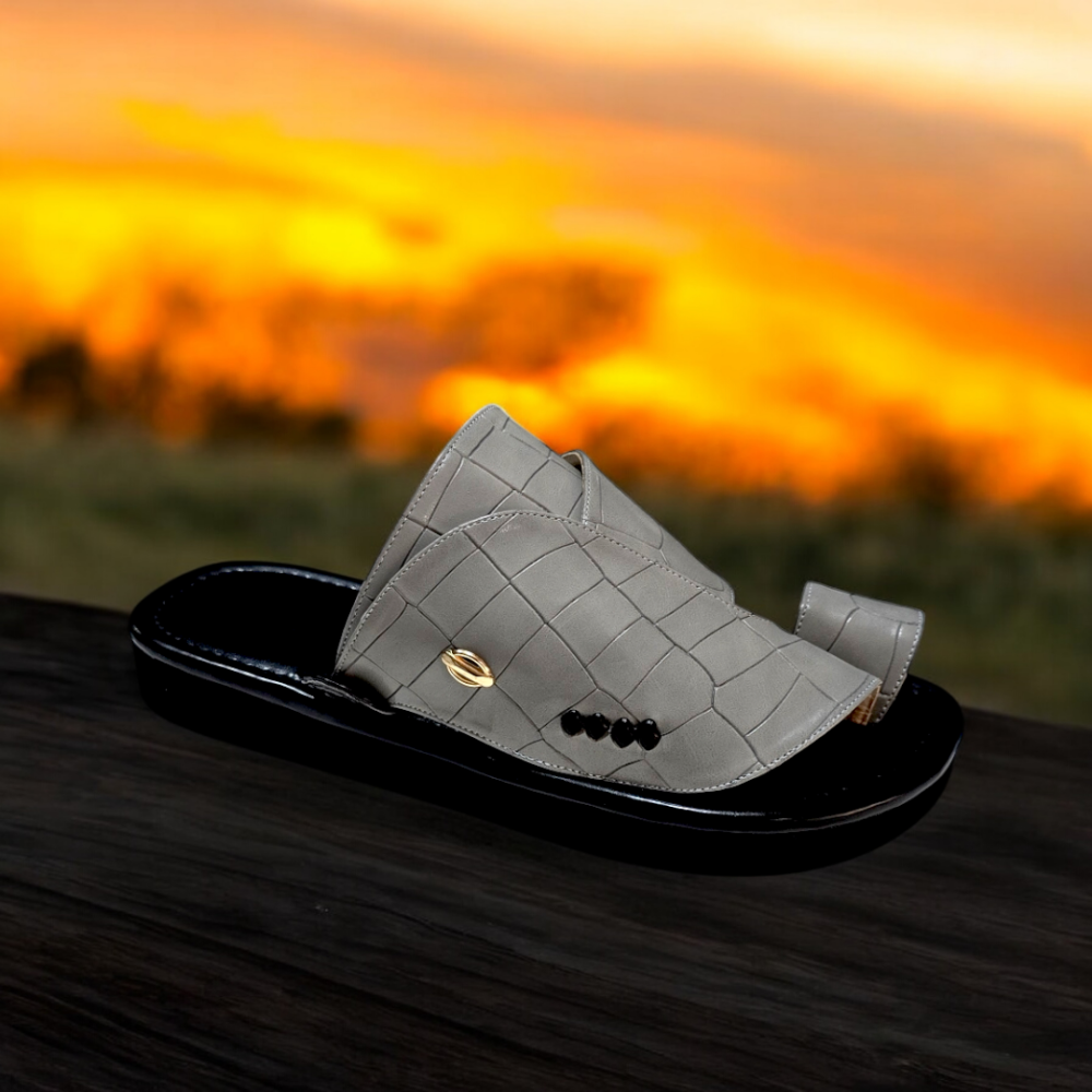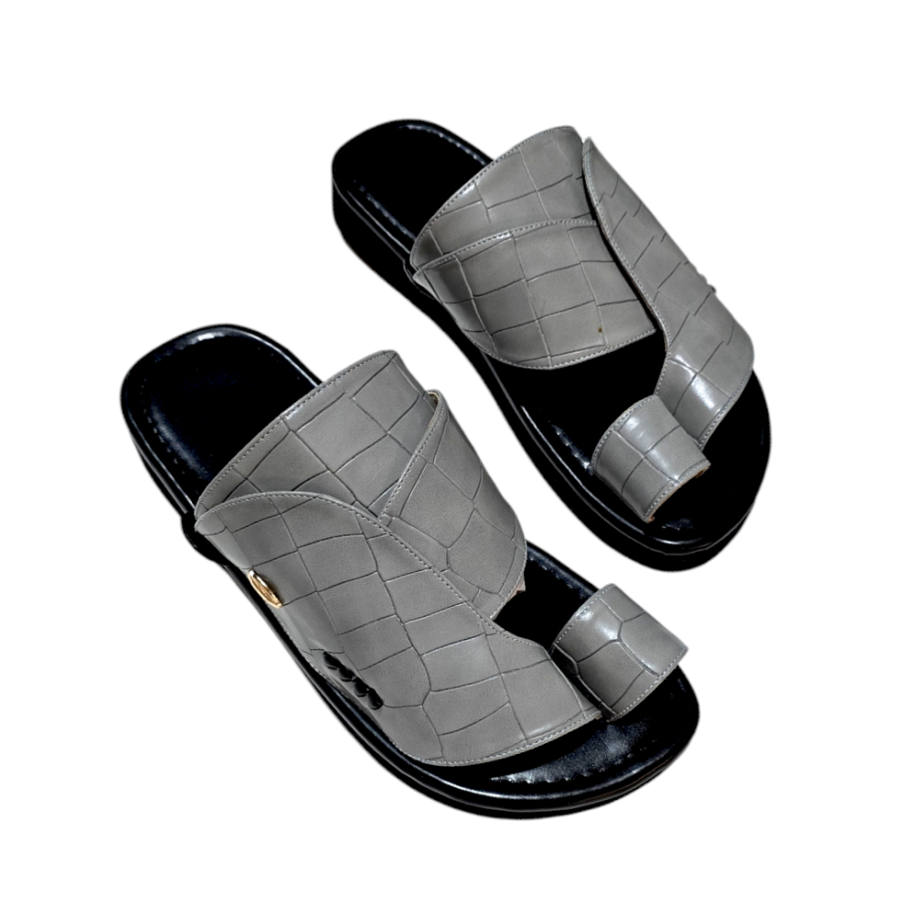 حذاء شرقي رصاصي بنقشة جلد تمساح، تصميم فاخر وارتفاع وسط مناسب، بطانة جلد طبيعي ودعسة ميموري فوم توفر راحة استثنائية، منتج وطني بجودة عالية.