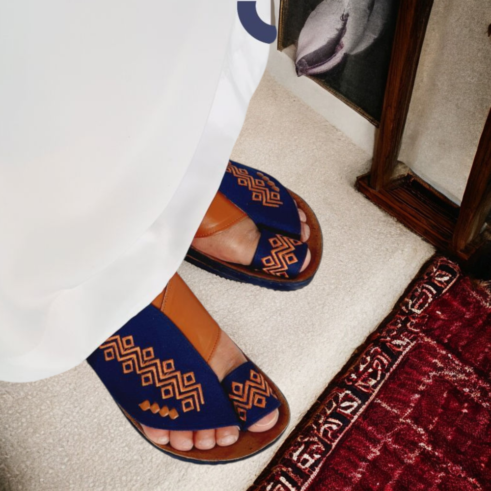 حذاء شرقي بتطريز حفر أنيق من المخمل الكحلي الفاخر، دعسة مريحة، بطانة جلد طبيعي بالكامل، تصميم يجمع بين الفخامة والراحة، مثالي للدوام والمناسبات.