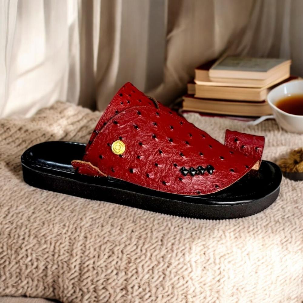 حذاء شرقي زبيري بلون عنابي مميز، من جلد طبيعي فاخر بنقشة نعام جذابة، دعسة طبية مريحة من ميموري فوم، بطانة جلد طبيعي بالكامل، وارتفاع ربر وسط يجمع بين الراحة والأناقة.