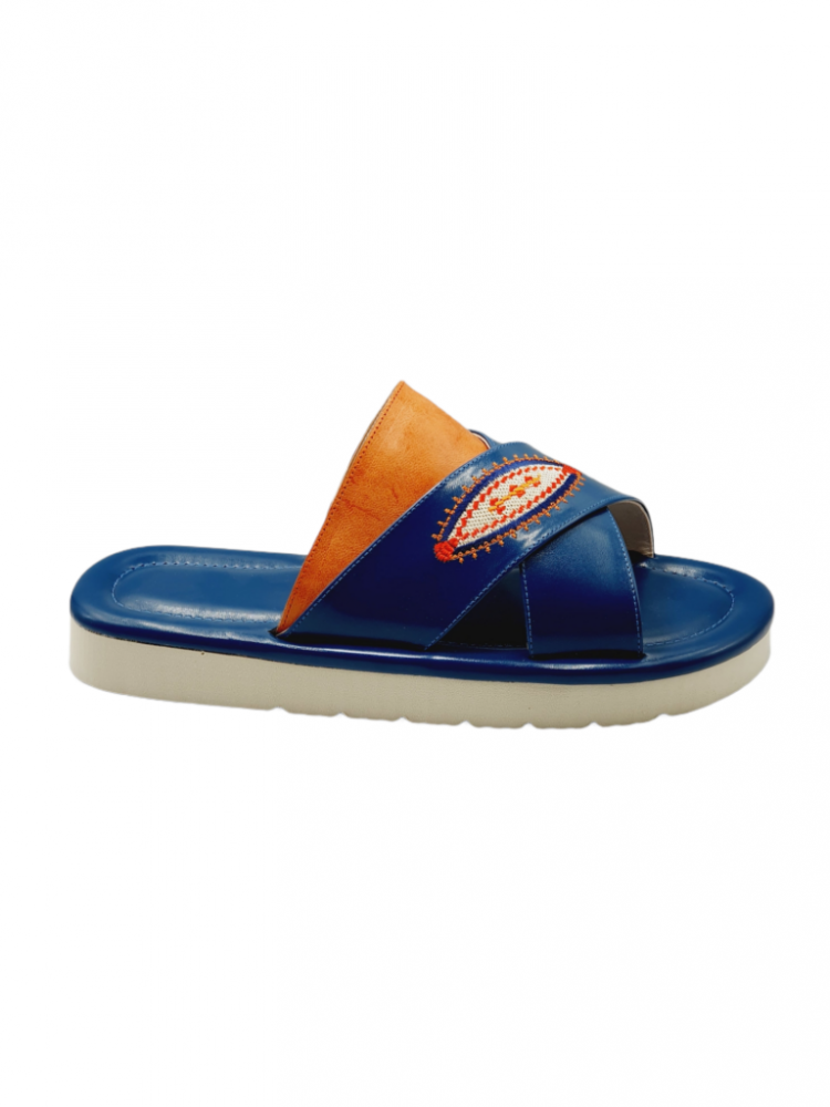 حذاء شرقي بتصميم مفتوح من الخلف، بلون كحلي أنيق، مصنوع من جلد فاخر بالكامل، مبطن ببطانة جلد طبيعية، دعسة ميموري فوم، وراحة مثالية للاستخدام اليومي