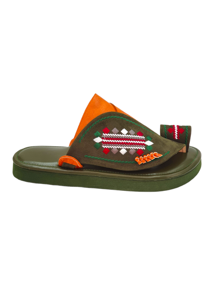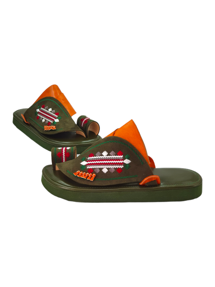تميز بإطلالة شرقية فاخرة مع حذاء زيتوني مطرز بتنسيق برتقالي جذاب. بطانة داخلية مريحة، دعسة ميموري فوم ناعمة، وارتفاع متوازن. جودة سعودية بكل فخر.