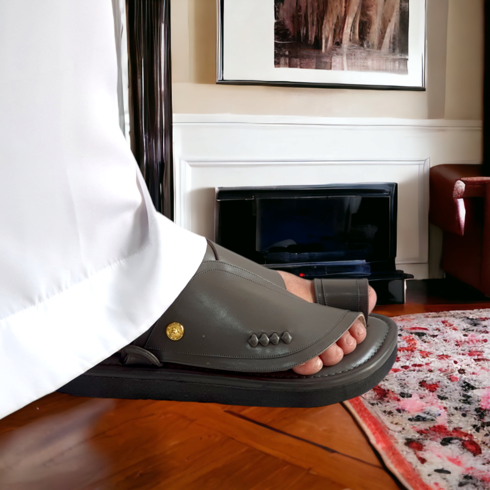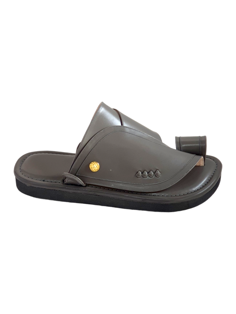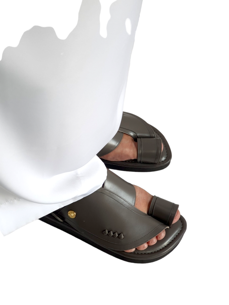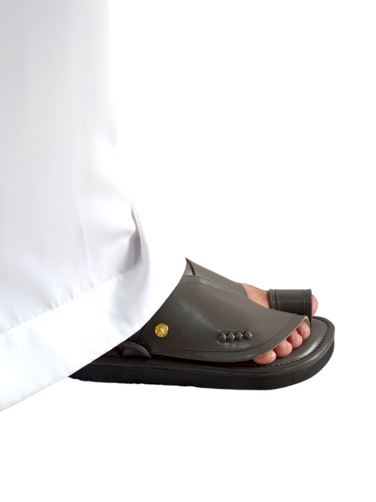 حذاء شرقي رصاصي سادة بتصميم أنيق وعملي، جلد بالكامل من الداخل والخارج، دعسة ميموري فوم مريحة، ارتفاع وسط للربر، جودة وطنية سعودية تناسب المناسبات والدوام اليومي