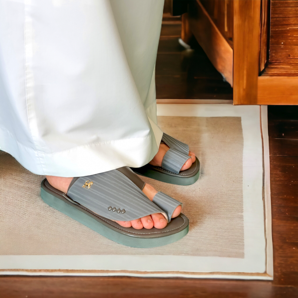 حذاء شرقي أنيق بلون رصاصي بنقشة فاخرة، مصنوع من جلد طبيعي بالكامل، ارتفاع دبل من الربر لراحة مثالية، دعسة ميموري فوم لينة، تصميم زبيري وطني بجودة عالية.