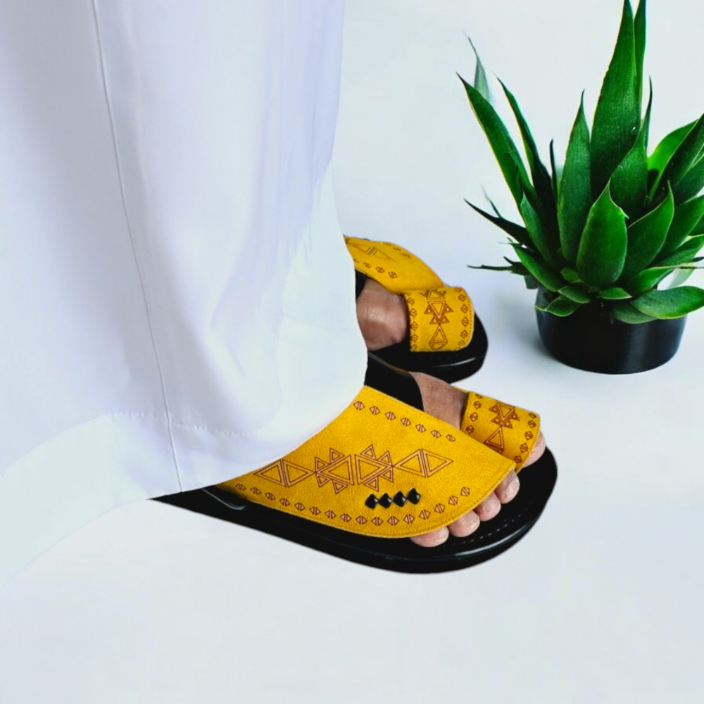 تميز بإطلالة فاخرة مع حذاء شرقي ليزر أصفر × أسود، تصميم مخمل أنيق وارتفاع وسط، دعسة لينة ميموري فوم وبطانة جلد طبيعي بالكامل، راحة وأناقة بصناعة وطنية.