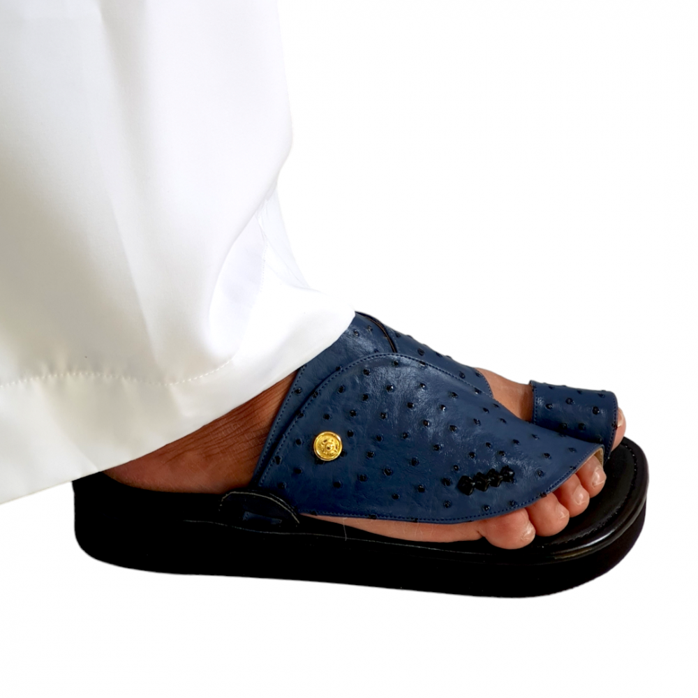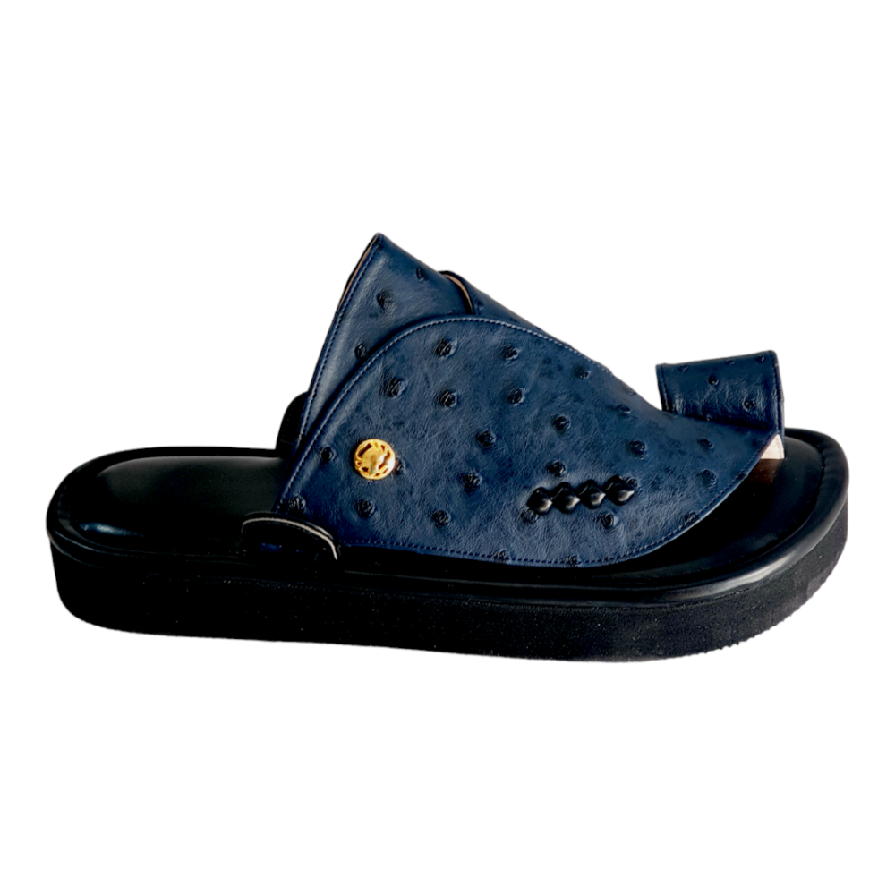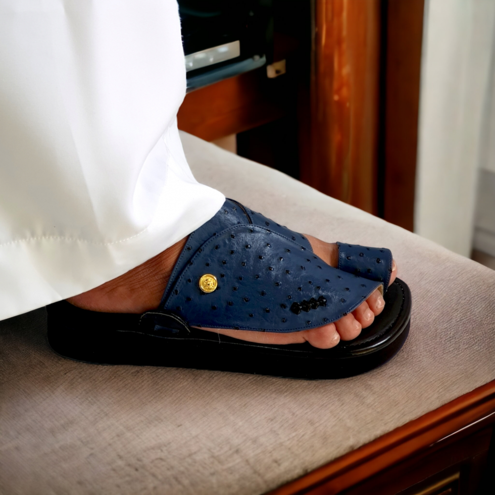 استمتع بالأناقة الشرقية مع حذاء زبيري فاخر بلون كحلي × أسود، بنقشة جلد نعام جذابة، دعسة لينة ميموري فوم، وبطانة جلد طبيعي بالكامل، وارتفاع مريح، صناعة وطنية سعودية.